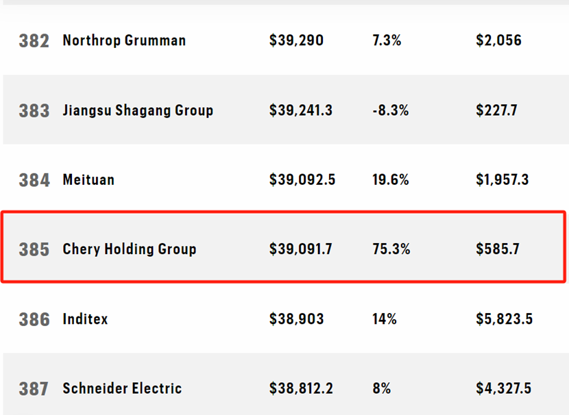 في 5 أغسطس 2024، دخلت شركة تشيري القابضة لأول مرة في قائمة "فورتشن جلوبال 500"، محتلة المرتبة 385 بإيرادات بلغت 39.0917 مليار دولار.